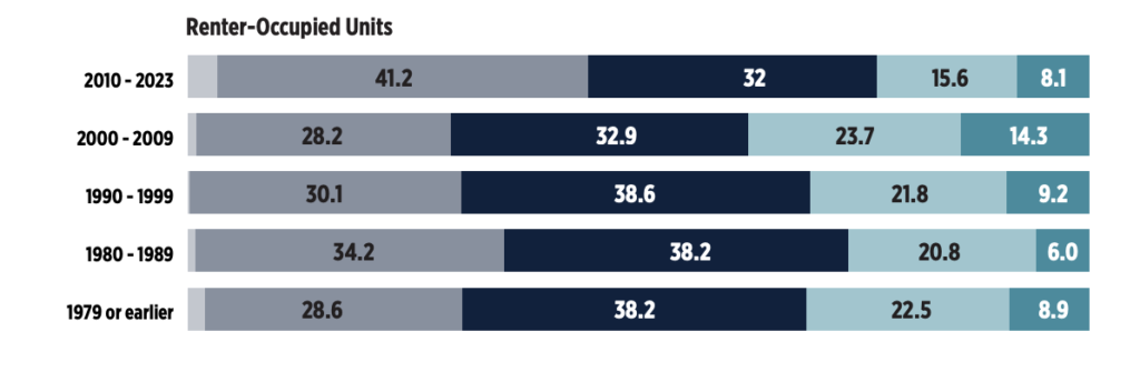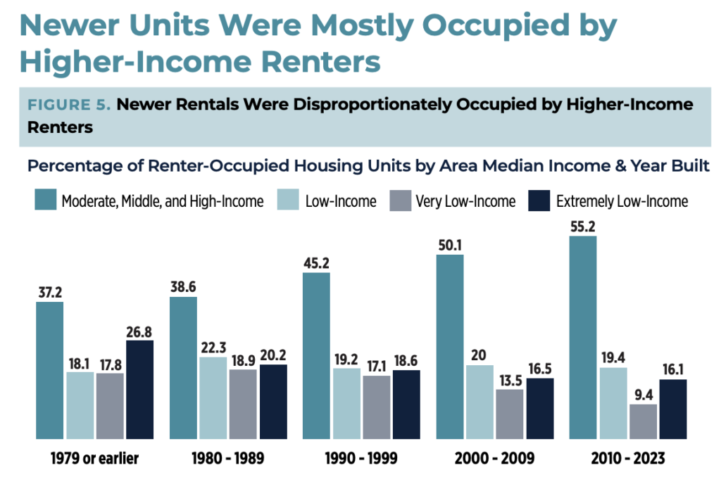 We shouldn’t be surprised, then, that the researchers found that newer units tended to be occupied by wealthier renters. Tenants with extremely low-, very low-, and low-incomes each accounted for less than one-fifth of occupants in newer units.
