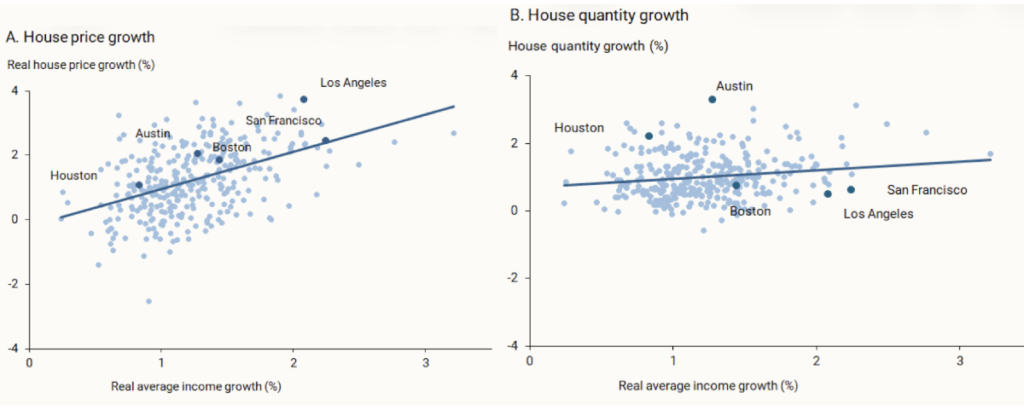 In a letter released last month, researchers from the Federal Reserve Bank of San Francisco and UC Irvine, Schuyler Louie, John Mondragon, Rami Najjar, and Johannes Wieland, argue that “income growth relates strongly to house price growth and that house prices generally keep pace with average income. However, there is almost no connection between average income growth and growth in housing supply.”
